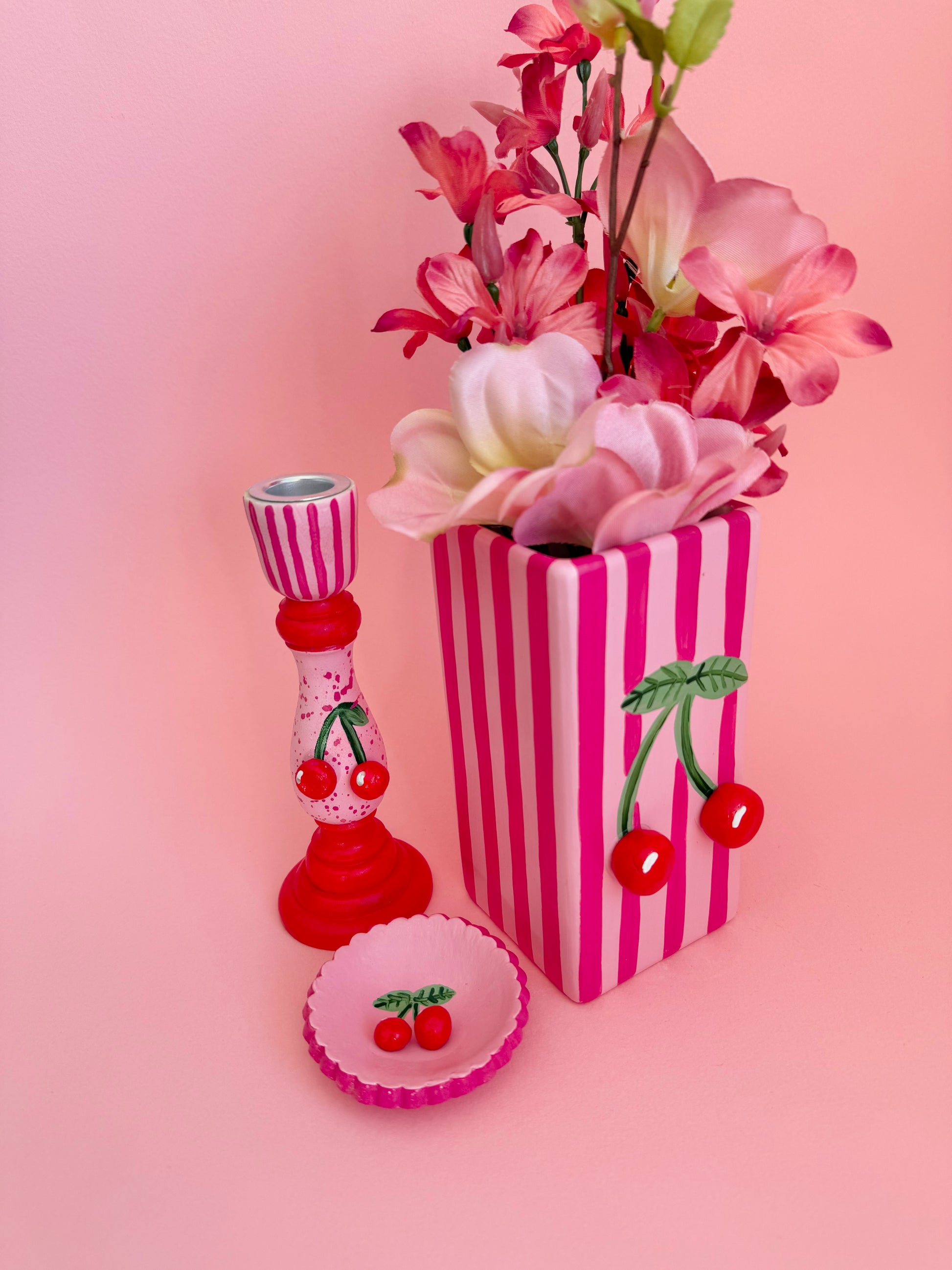 Pink Stripe Cherry Ceramic Vase Hand Painted